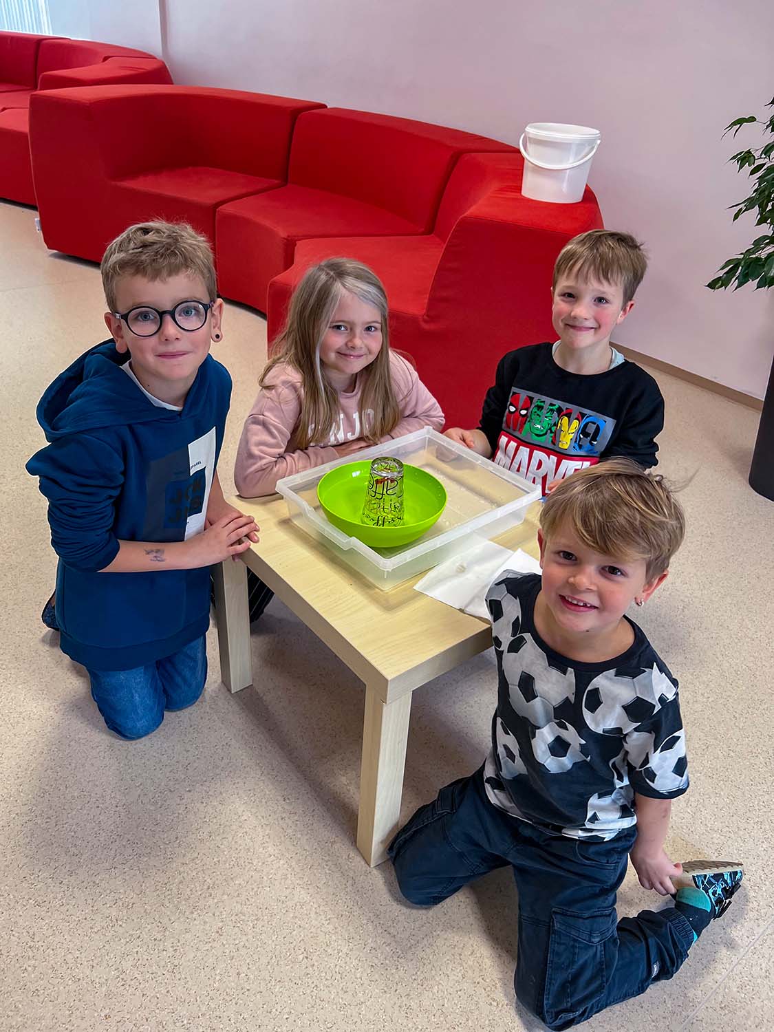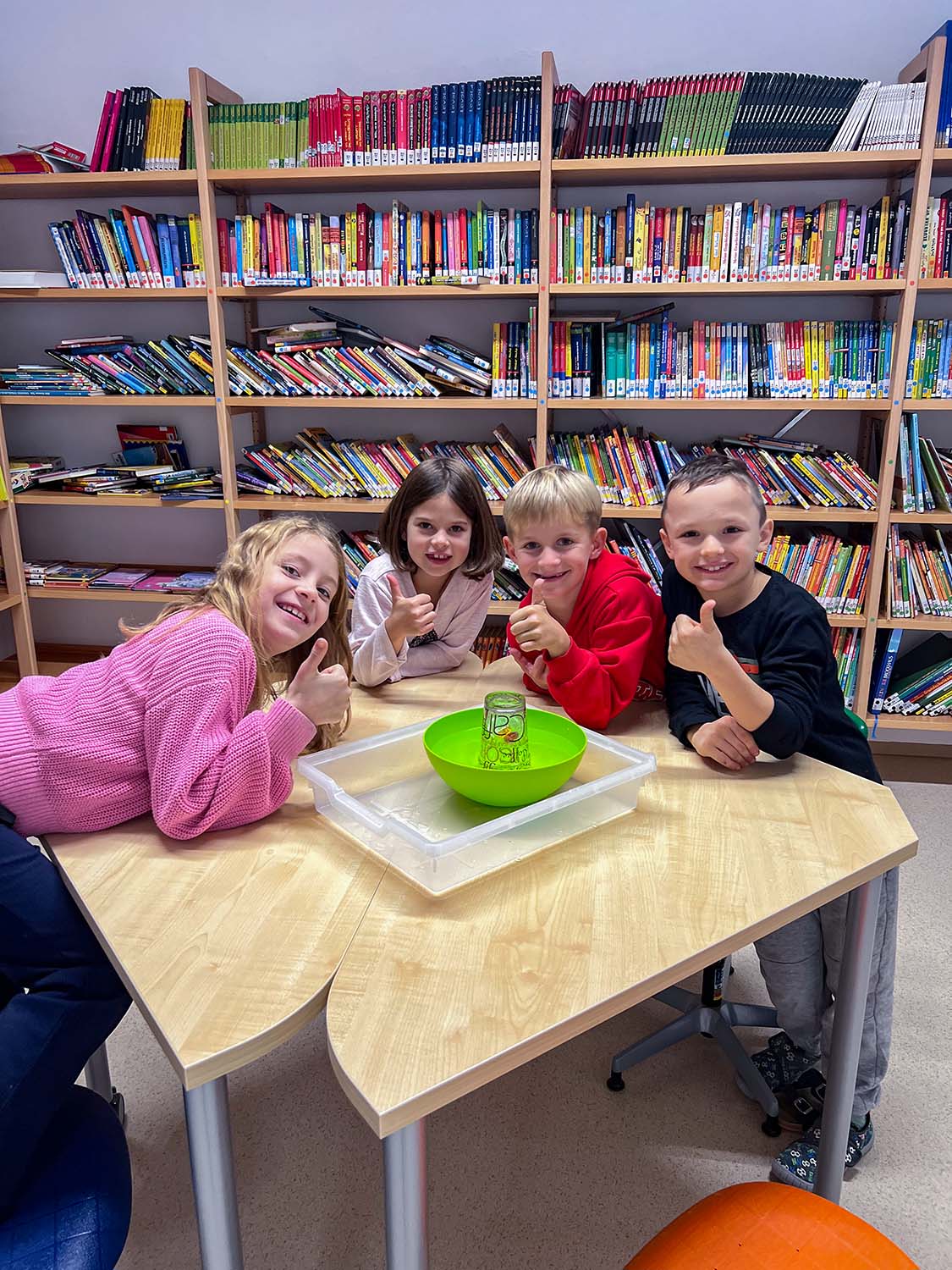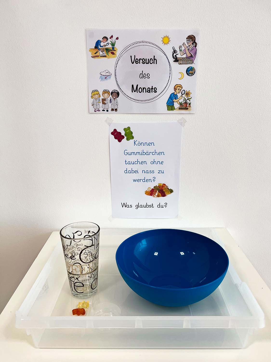 Die 2a-Klasse experimentierte heute mit großer Begeisterung. Die Schüler*innen waren dabei äußerst kreativ und fanden nicht nur einen, sondern gleich mehrere Lösungswege, um die Gummibärchen unter Wasser zu bringen, ohne diese dabei nass zu machen.